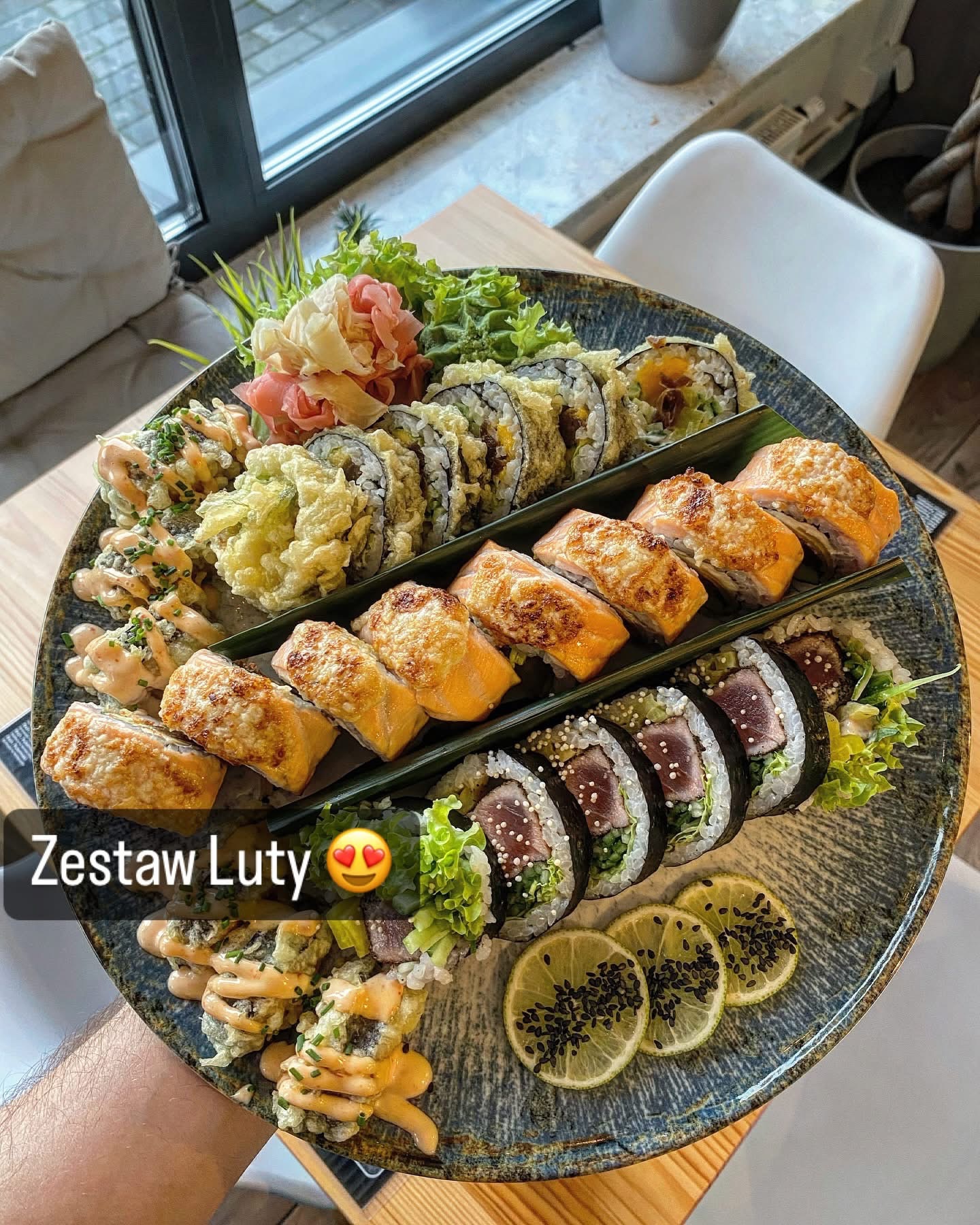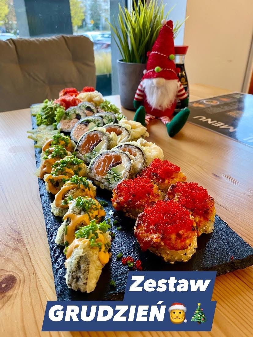 z krewetkami w tempurze, plastrami łososia, sałatką z paluszków krabowych -